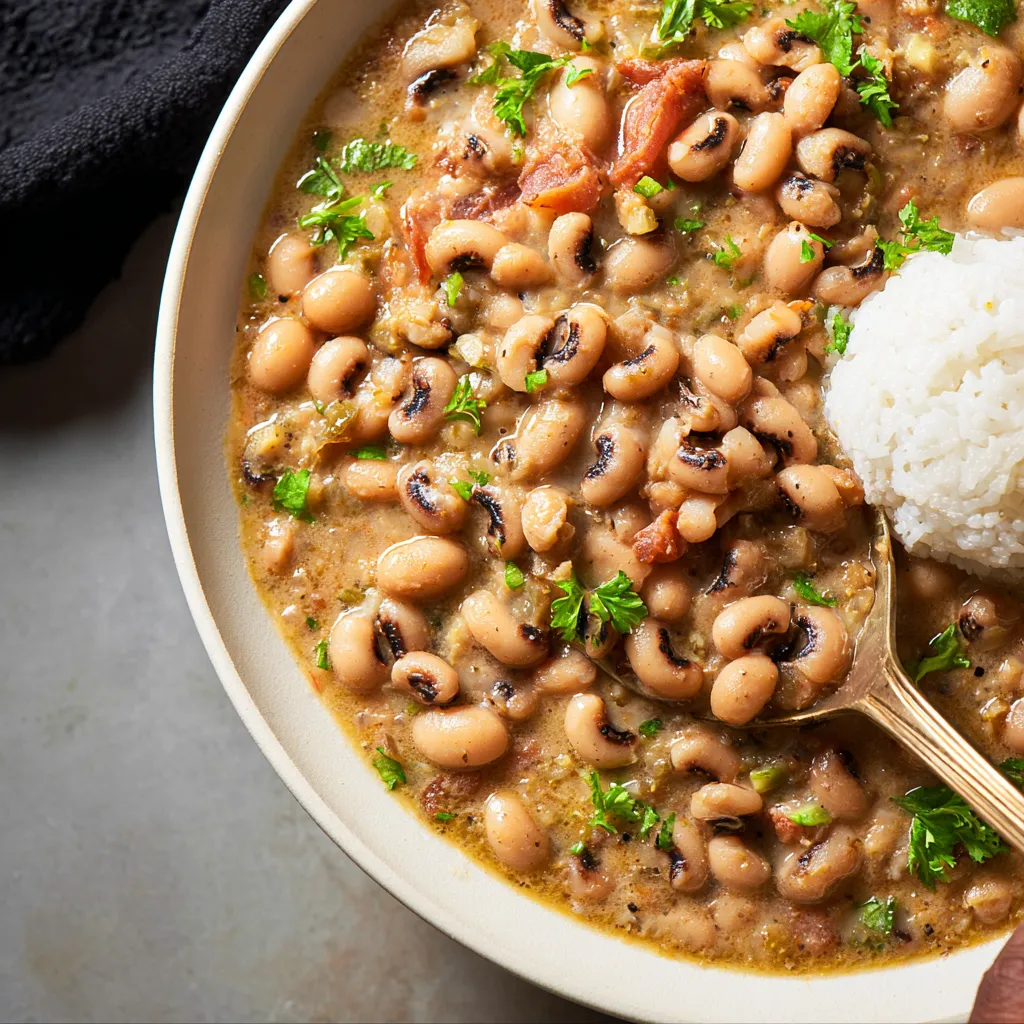 - Ladle generous portions of the thick, luscious black eyed peas into warm bowls, making sure to get plenty of that gorgeous creamy sauce. Crown each serving with a generous sprinkle of your freshly made Spicy Cornbread Crumble. For a final flourish, add a vibrant sprig of fresh parsley or a few thinly sliced green onions over the crumble to introduce a touch of freshness and a beautiful pop of color.
