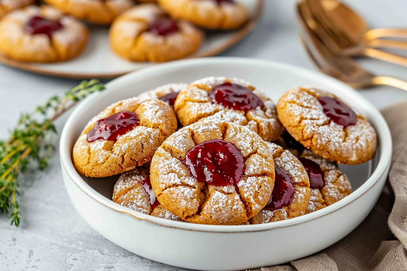 Delightful Gingerbread Thumbprint Cookies with Cranberry Sauce, featuring a spicy gingerbread cookie with a tangy-sweet cranberry filling. Perfect for holiday gatherings and festive treats.