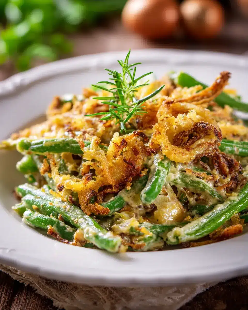 Green bean casserole is the perfect side dish for Thanksgiving, Christmas, or any holiday gathering. It also pairs well with roasted chicken, pork, or beef. Serve it hot and bubbly straight from the oven. A sprig of fresh thyme or parsley adds a touch of elegance.