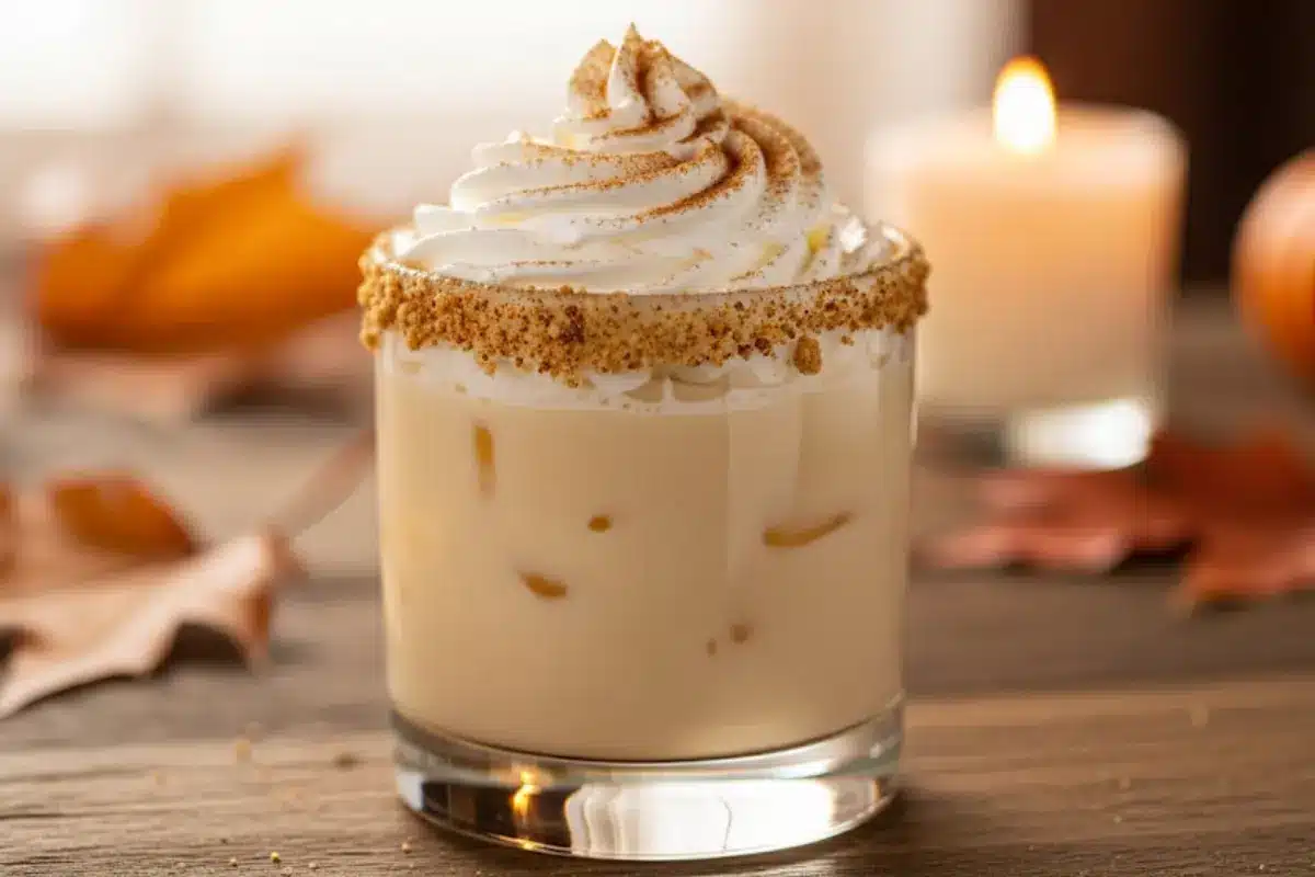 A Pumpkin Spice White Russian typically contains vodka, Kahlúa coffee liqueur, and pumpkin spice creamer. The recipe often includes garnishes like a spiced rim with graham crackers, sugar, and whipped cream.