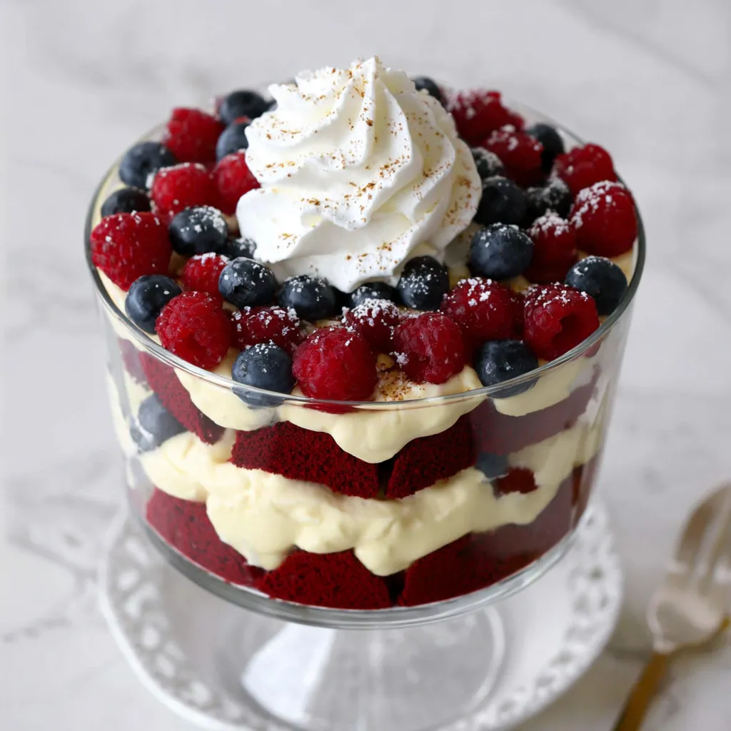 Discover a delectable Red Velvet Berry Trifle combining rich layers of red velvet and fresh berries for a perfect dessert delight